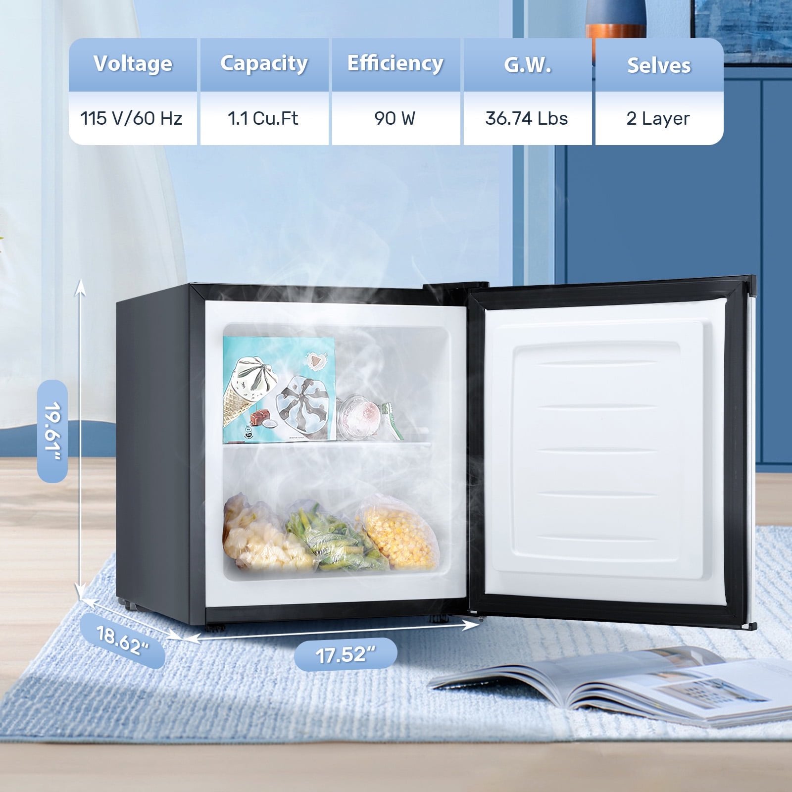 【Compact Space, Big Storage】 This 1.1 cubic foot upright freezer measures 17.5 inches (width) × 18.62 inches (depth) × 19.61 inches (height), making it a great addition to homes, dormitories, kitchens, and offices choose. Whether it is breast milk, meat, aquatic products, cold drinks or frozen food, it can handle it easily.
