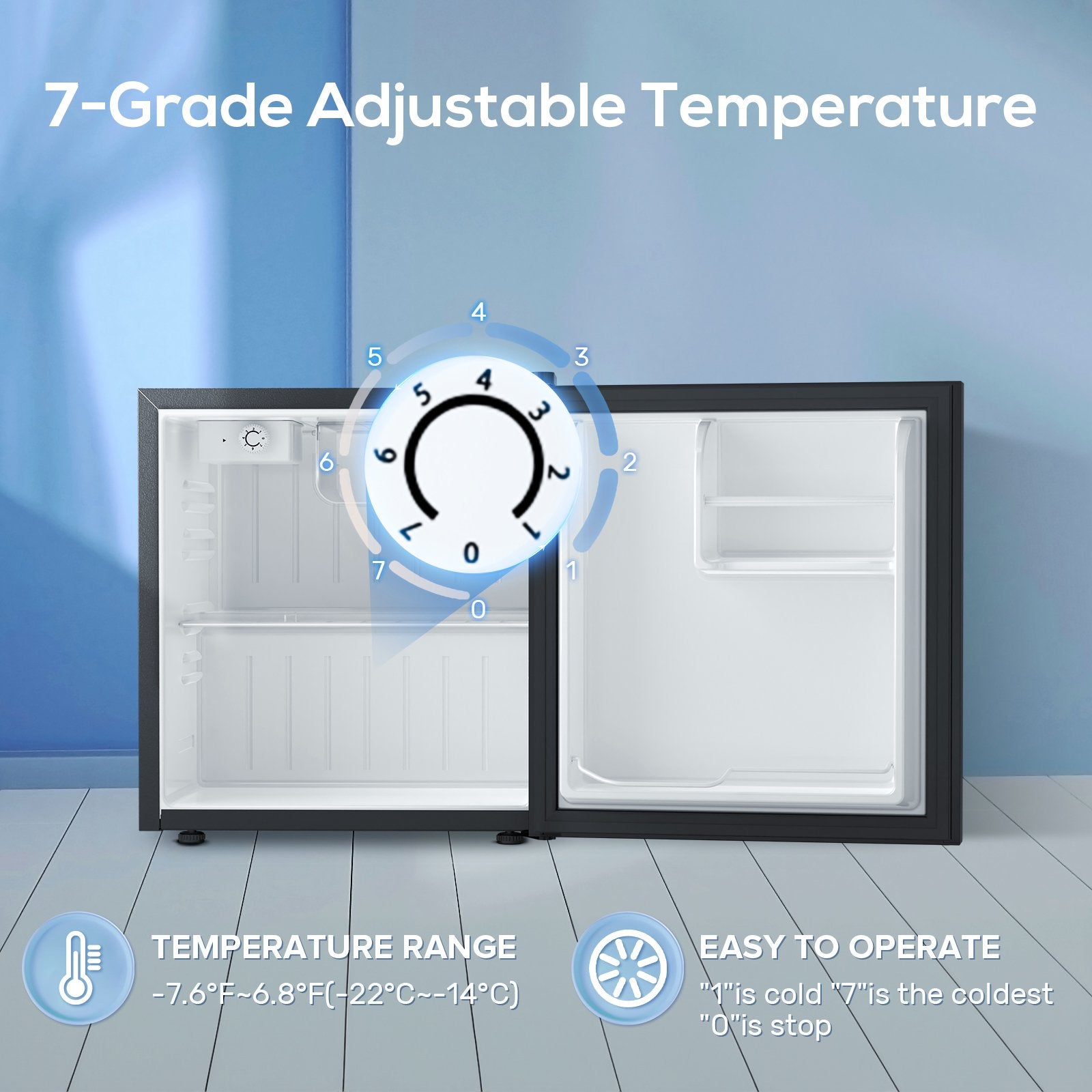 🍖 Thermostat control on the back: Adjustable 7-grade temperature control on the back of Freezer to select your desired temperature. “1” being the warmest and “7” being the coldest. Initially set the temperature on “4”. Temperature can be controlled from -7.6℉ to 6.8℉(- 14℃ to - 22℃)
