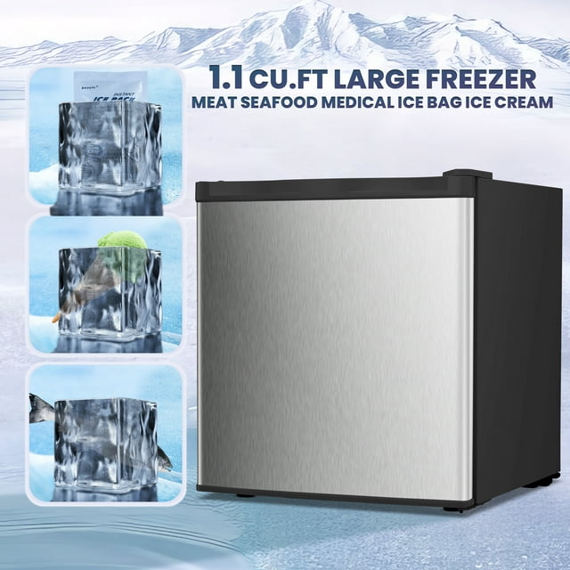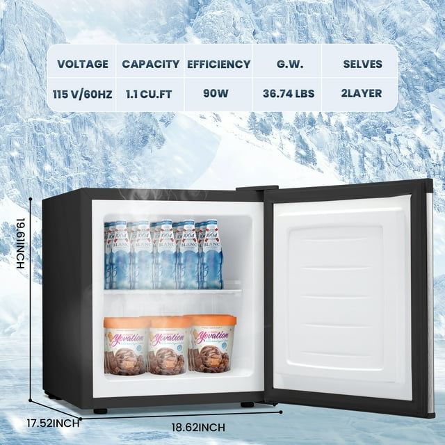 🍖 Upright Freezer Dimensions: 1.1 cubic feet free standing upright freezer, Measures: 17.5”(W)*18.62”(D)*19.61”(H). Compact Freezer saving design. Great using for breast milk, meat, aquatic products, cold drinks, quick-freezing and other purposes. It could for Home,Dorms,Kitchen and Office.