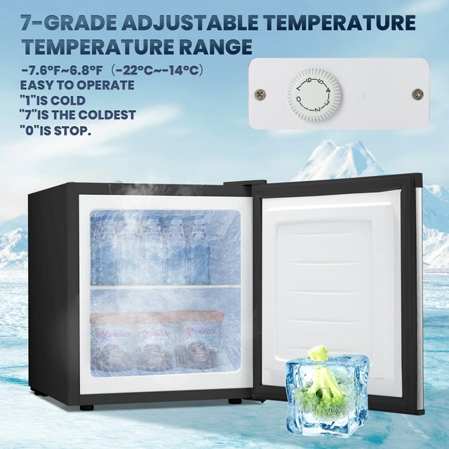 he 1.1 Cu.ft Compact Upright Freezer with Reversible Single Door, Removable Shelves and Adjustable Thermostat is the perfect freezer for small spaces in homes, kitchens or offices. Its compact size and sleek black design make it a stylish addition to any room while providing ample storage space for your frozen food items. The removable shelves allow for customizable storage, so you can easily organize items of different sizes. The adjustable thermostat lets you set the ideal temperature to keep your food fresh for longer periods of time. The reversible single door allows for easy access and placement in any corner of the room. Get the convenience and reliability of a full-sized freezer in a smaller package with the 1.1 Cu.ft Compact Upright Freezer.